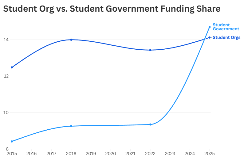 Meanwhile, independent orgs operate on fixed budgets, limited guidance, and a revolving door of unpaid volunteers. From 2018 to 2025, their share crawled from 14.00% to 14.12%. Over that same stretch, Student Government’s allocation surged nearly 60%, from 9.26% to 14.70%.